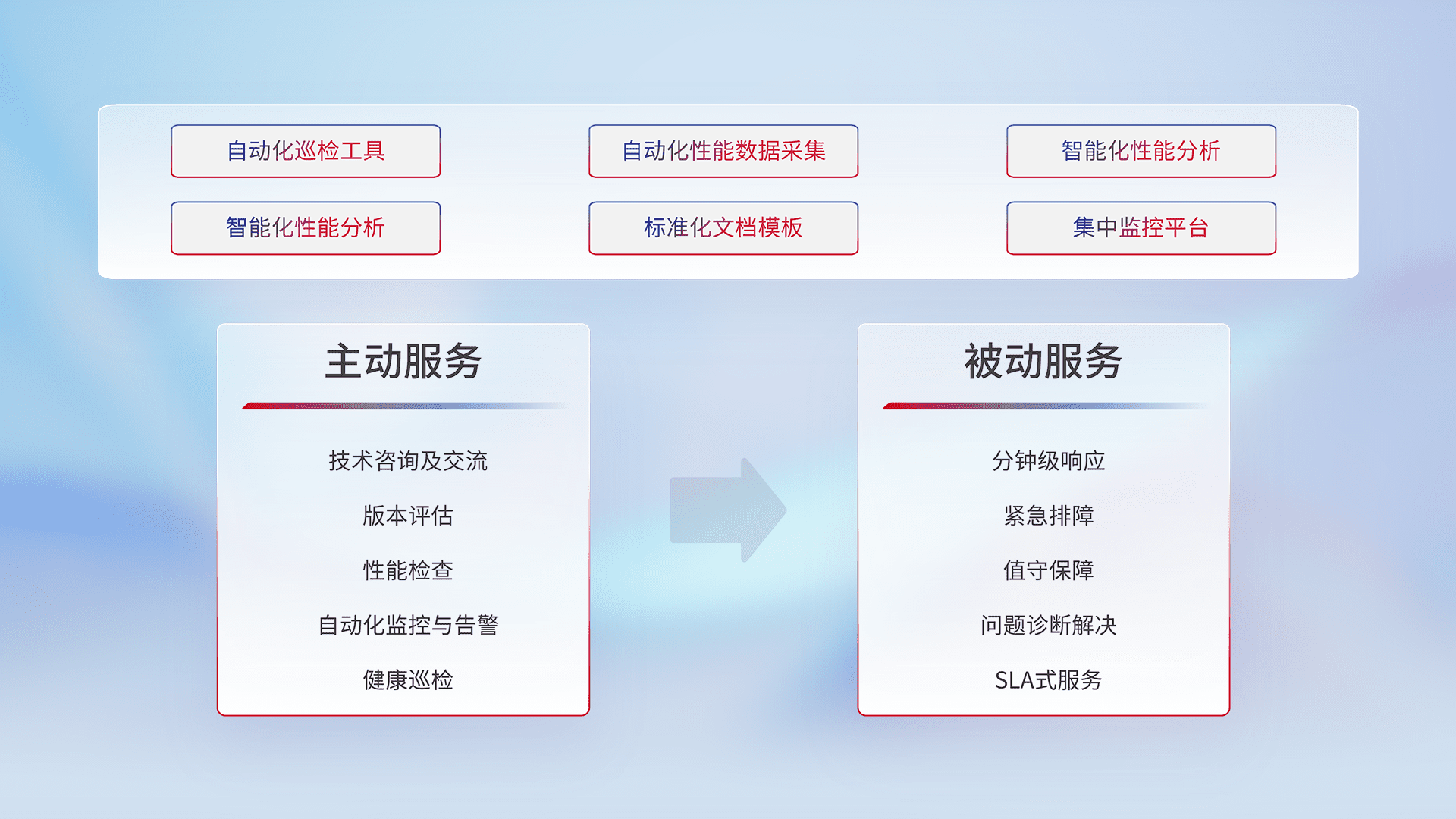 智能化工具和标准化文档,,,保障服务质量,,提供主动服务(包含技术咨询、、、版本评估、、、性能检查、、、、自动化监控与告警、、、健康巡检)和被动服务包含(分钟级响应、、、、紧急排障、、、、值守保障、、、、问题诊断解决、、、、SLA服务)。。。。
