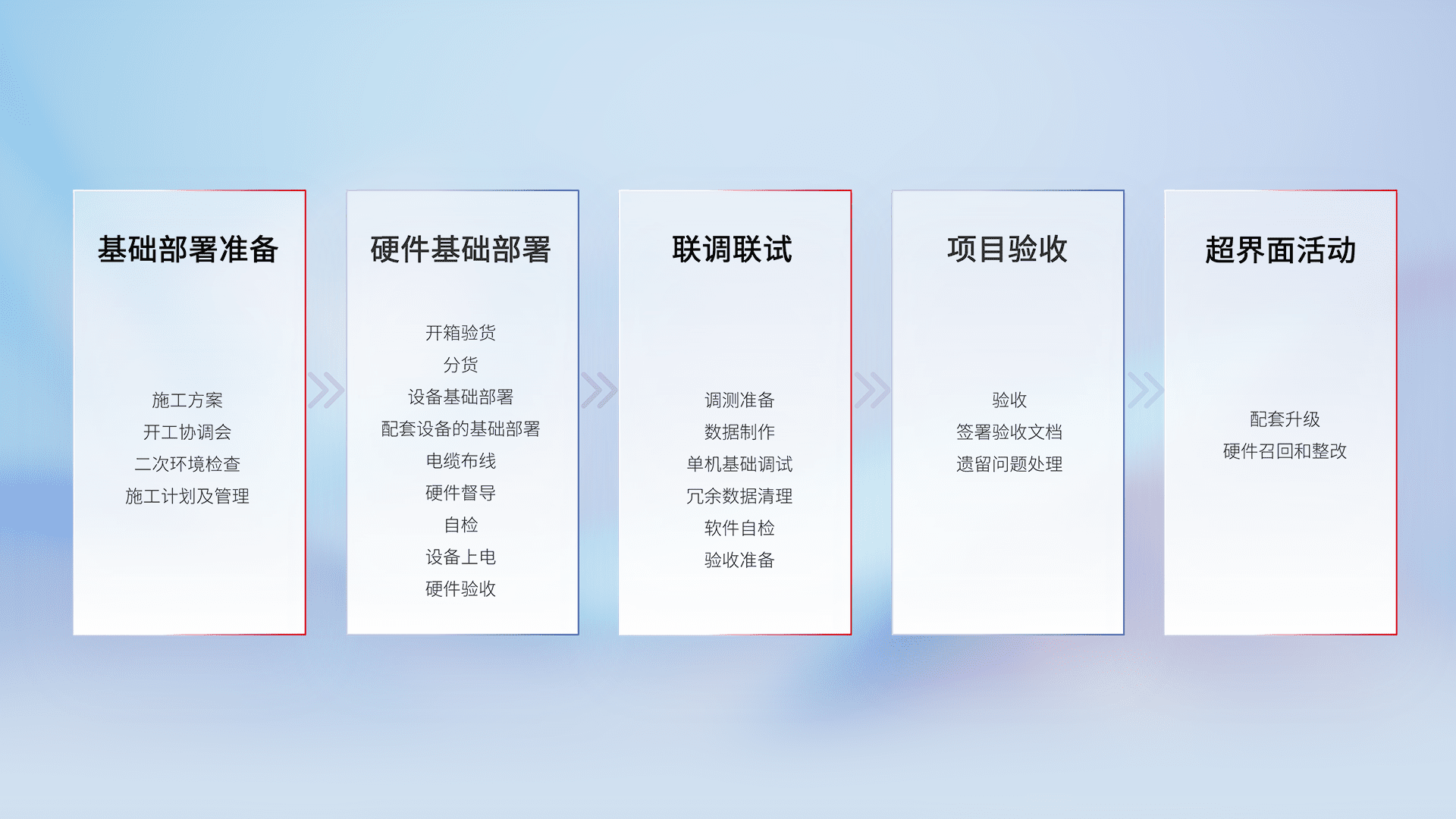 从基础部署准备、、硬件基础部署、、、、联调联试、、、项目验收、、越界面活动的全过程可追溯,,,保证施工质量和进度。。